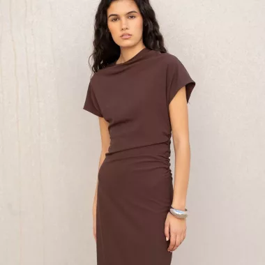 Vestido midi drapeado en colores marron, negro y rojo, original y práctico, ideal para cualquier ocasión.