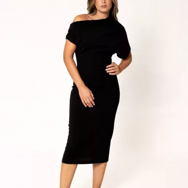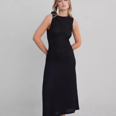 Vestido midi asimétrico punto calado en color negro, moderno y dinámico, ideal para cualquier ocasión.