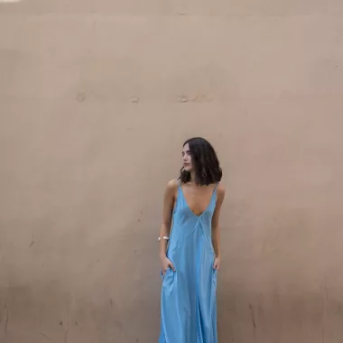 Vestido midi con tirantes en color celeste, moderno y actual, ideal para cualquier ocasión.