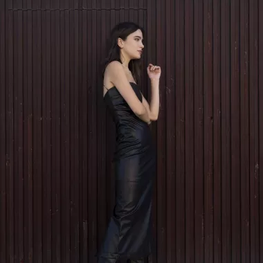 Vestido midi efecto piel en color negro, clásico y exclusivo, ideal para cualquier ocasión.