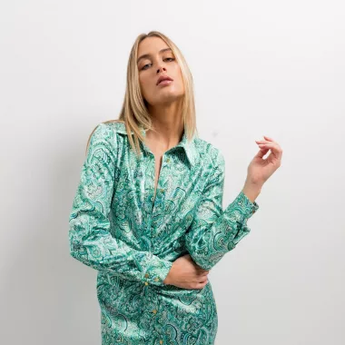 Este vestido camisero estampado en colores burdeos, caqui y verde añade un toque versátil y delicado a tu armario. Esta prenda versátil se convertirá en tu aliada para crear conjuntos tanto casuales como más formales. Fabricado con tejidos de primera, ofrece un ajuste cómodo y favorecedor.